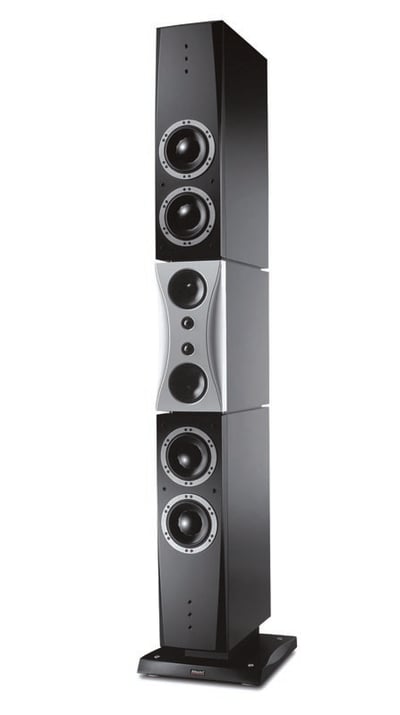 Deux haut-parleurs à cône en MSP et deux tweeters à dôme souple sont intégrés dans la partie centrale, qui est elle-même réalisée en aluminium massif usiné CNC. Les caractéristiques de ce matériau ainsi que ses côtés spécifiquement arrondis assurent une dispersion sonore uniforme et incolore.